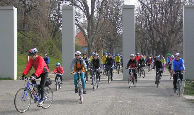 jsme cyklostezkou údolím podle hřišť, přes první Pražskou křižovatku se semaforem pro cyklisty a kolem Krčského zámečku.